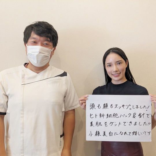 関西で仕事があるときは必ず寄らせていただいています。頭も顔もスッキリしました。ヒト幹細胞パック&針で美肌をゲットできました‼