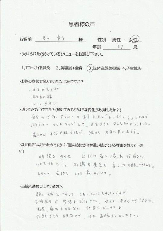 私も鍼灸が初めてでしたが、多くの方が結果を出されているのを見て、また、数少ない美容鍼灸師ということで安心して予約に踏み切ることができました。