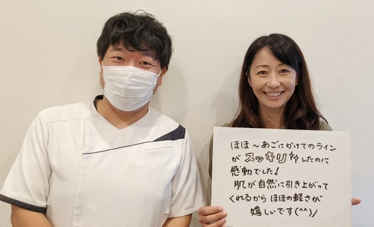 こちらで施術を受け、ほほ~顎にかけてのラインがスッキリし、その状態が維持できるようになりました。肌が自然に引きあがっていく感じでほほの重さが軽くなったのが嬉しいです。