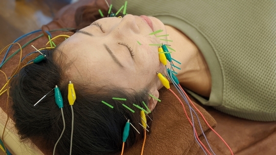 当院ではお顔の鍼に電気をつないで特定の周波数で電気を流すことで『毛細血管の新生』を行い、筋肉の収縮と弛緩も利用してお顔周りの老廃物を流し、しっかりと皮膚が栄養される状態を作っていきます。