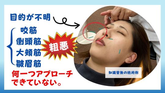 当然、クマの種類も分類できなければ、効果的なリフトアップのさせ方も知りません。内出血を起こしにくい鍼の抜き方すら知りません。