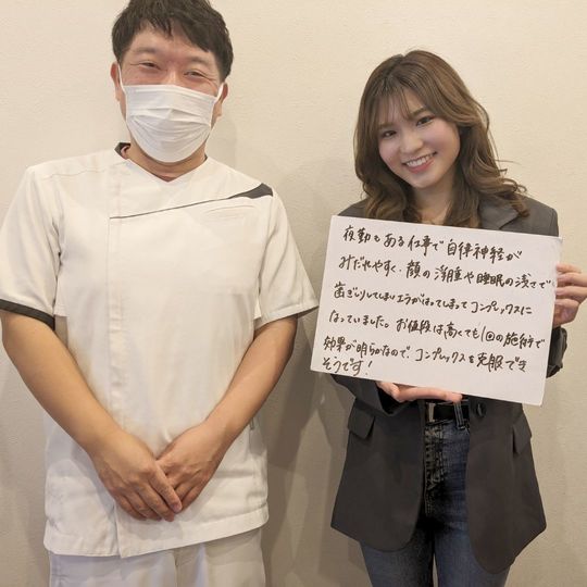 関西で仕事があるときは必ず寄らせていただいています。頭も顔もスッキリしました。ヒト幹細胞パック&針で美肌をゲットできました‼