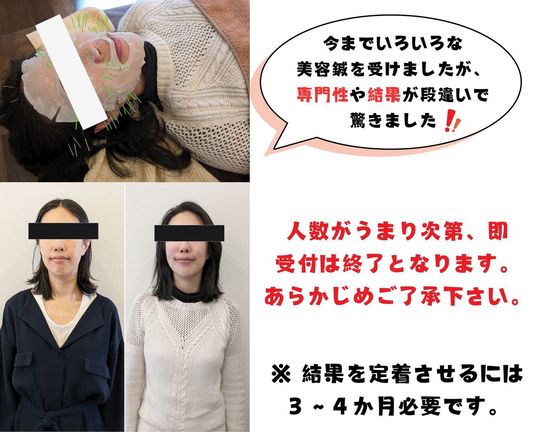 もともと安い美容鍼をしておりましたが、終わるたびに『とてもかわりましたね。』と言われ、そのやり取りに強い違和感を感じることもしばしば。