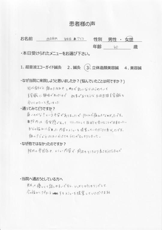 30代後半から顔のたるみや、シワが気になり始めていて、美容鍼に興味があったので効果がありそうな立体造顔美容鍼を受けてみたいと思いました。