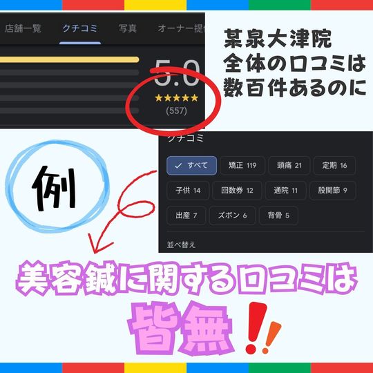 全体の口コミは数百件あるのに、美容鍼の口コミはたった5件しかない、というところもあります。しかし、そういった整骨院に限って【自信ありの美容鍼】という打ち出し方をしています。