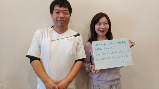 初回からしっかりと結果を出すことができました。施術の内容にとても喜んで頂き、大変うれしく思います。これから、目標に向かって一緒に頑張っていきましょう‼