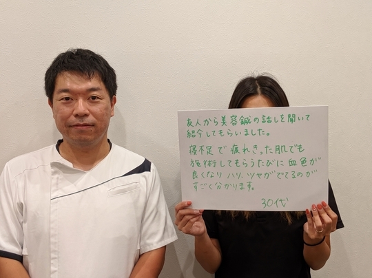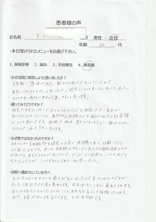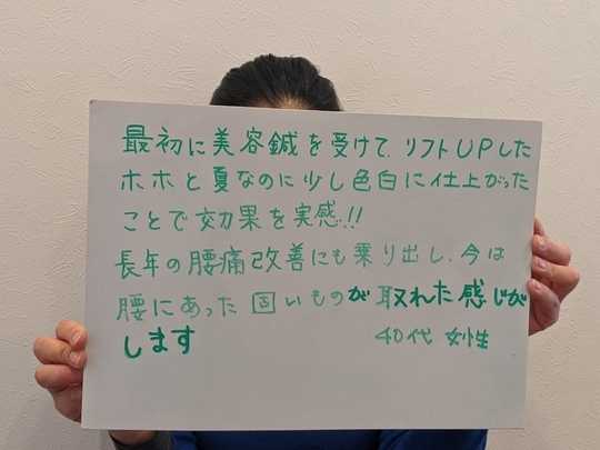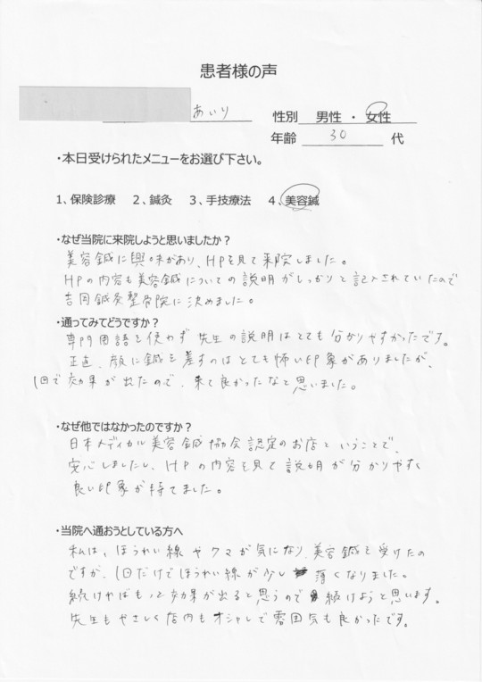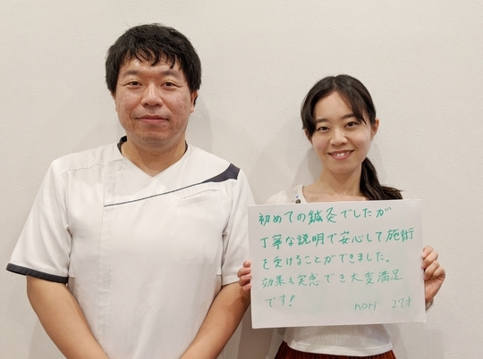 専門用語を使わず、先生の説明はとても分かりやすかったです。正直、顔に鍼を刺すのはとても怖い印象がありましたが、1回で効果が出たので来てよかったなと思いました。