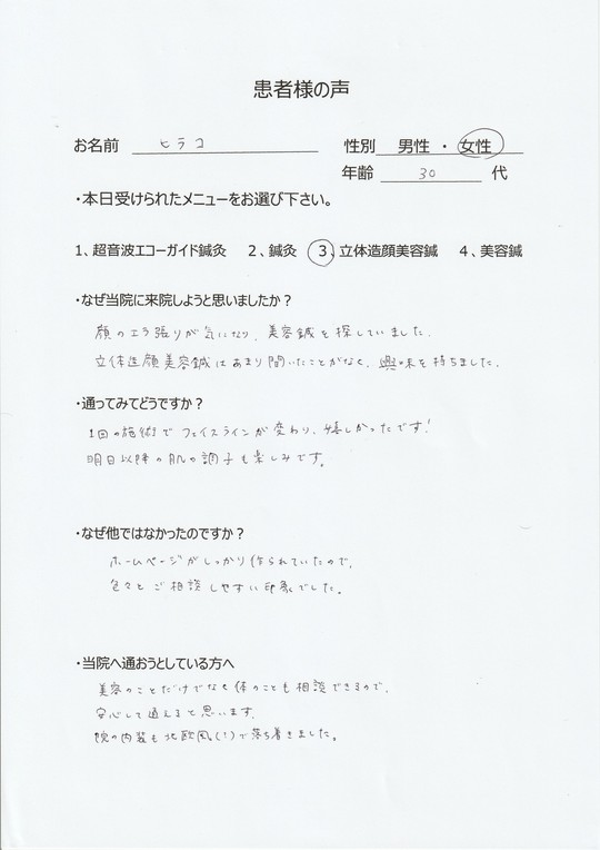 元々美容鍼を受けてみたいと思っていたのですが、ホームページを拝見して立体造顔美容鍼というワードに興味を持ち通い始めました。