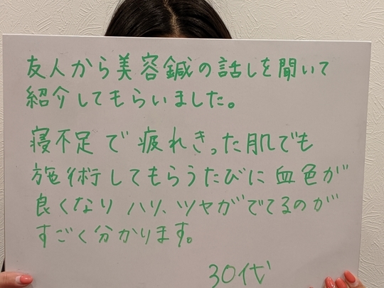 美容鍼が初めてという方も、他院で美容鍼を受けたことがあるという方にも、大変おすすめします!健康、美容双方の観点からアドバイスをいただけ、原因と結果にアプローチされており、根本的な原因から治療していただいている!と実感しました。
