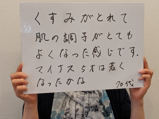 くすみが取れて肌の調子がとてもよくなった感じです。マイナス5歳は若くなったかな。