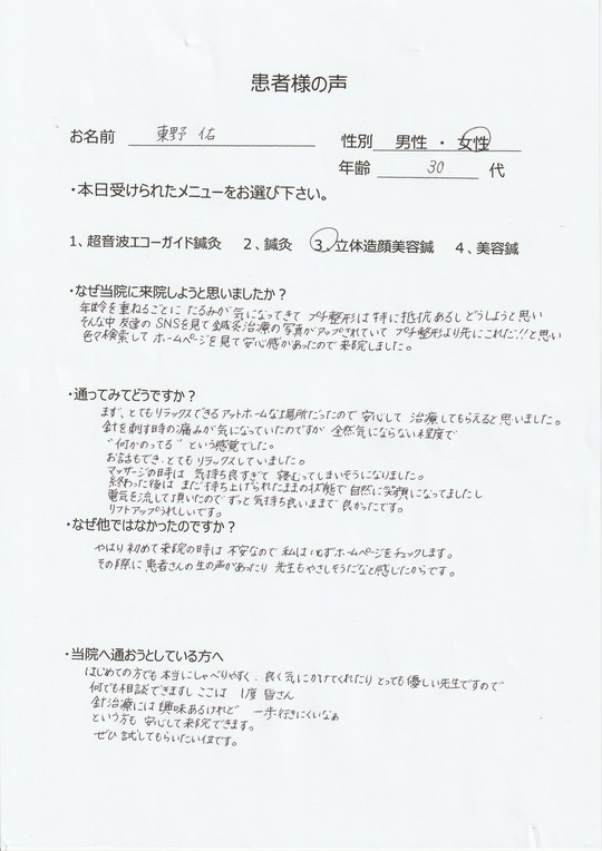 他院で普通の美容鍼を受け大変効果を感じていました。より高い効果を期待し、電気を使用する鍼に興味を持ちました。HPを拝見し、『立体造顔美容鍼』という言葉に惹かれ、吉岡鍼灸整骨院で施術を受けたい‼と思いました。